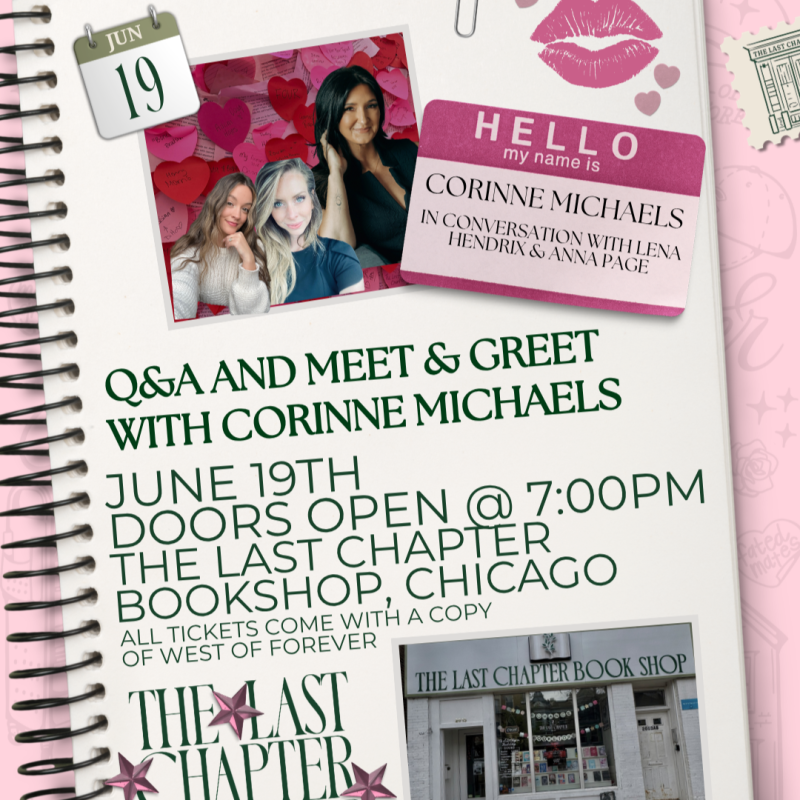 Come meet Corinne Michaels at The Last Chapter Book Shop for a book signing event celebrating her latest release, West of Forever! Stop by to meet the author, get your book signed, and connect with fellow romance readers. Each ticket will include a copy of West of Forever. Tickets are non-refundable. All events are 18+ and everyone in attendance will require a ticket.