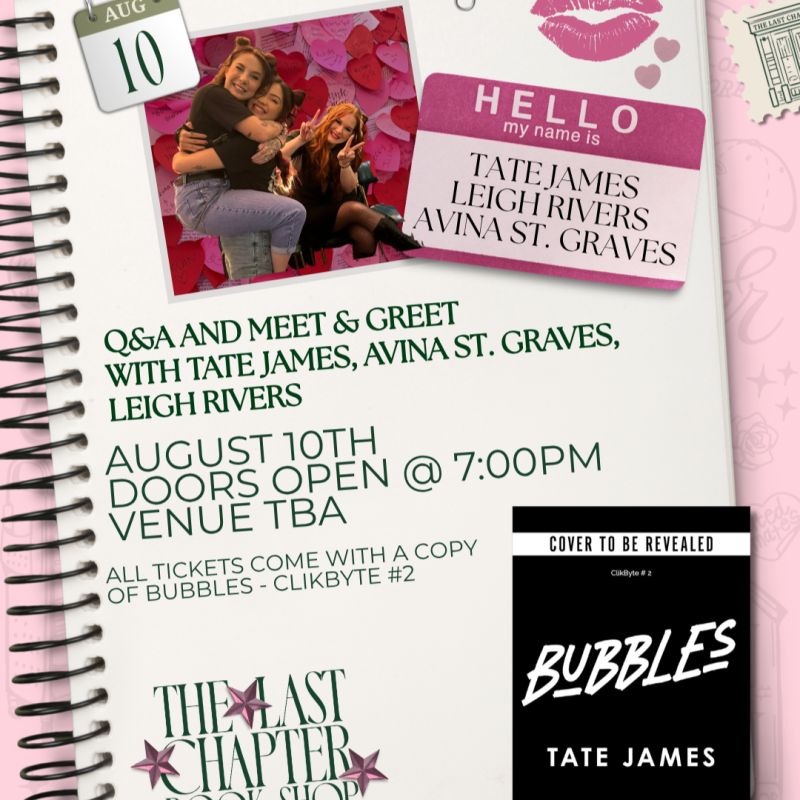 Join us for a special evening featuring authors Tate James, Leigh Rivers, and Avina ST. Graves with The Last Chapter Bookshop 💚